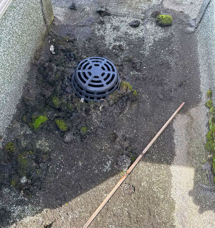 • Jedoch war der Regenschutz (= Laubfangkorb) eines Ablaufs gebrochen. Der Kunststoff war durch ständige Feuchtigkeit spröde geworden. Dies ist eine klassische Verschleißerscheinung.