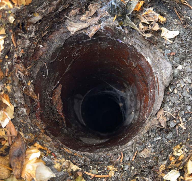 Der Steuernagel (auch Fallrohrstutzen) ist der Übergangspunkt, an dem das senkrechte Fallrohr in die horizontale Grundleitung mündet. Ist dieser Stutzen nur lose aufgesteckt oder undicht, dringen Erdpartikel und Wurzeln ein; zugleich kann Wasser nicht strömungsgünstig ablaufen, wodurch Sedimentablagerungen entstehen.