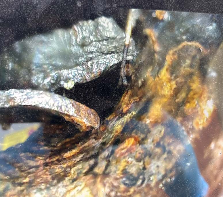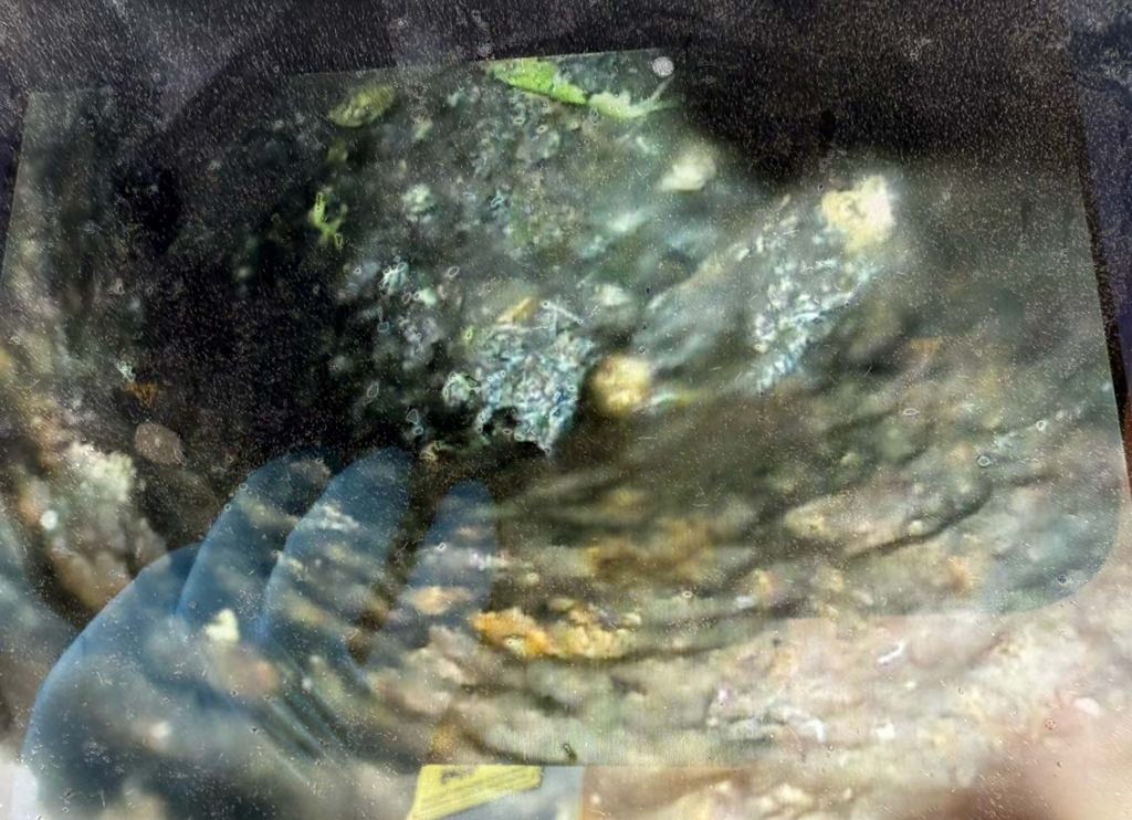 Die anschließende Kamerafahrt brachte Klarheit: Das alte Steinzeugrohr war gebrochen. Durch die Bruchstelle spülten sich über Monate Erdreich, Laub und feiner Straßenschlamm in die Leitung. Diese Sedimente verfingen sich jedes Mal erneut, sobald ein Regenguss kam, und führten zum kompletten Verschluss. Außerdem war der Steuernagel (der Übergang vom Fallrohr in die Grundleitung) nur aufgesteckt. Auch hier drang Material in den Spalt.
