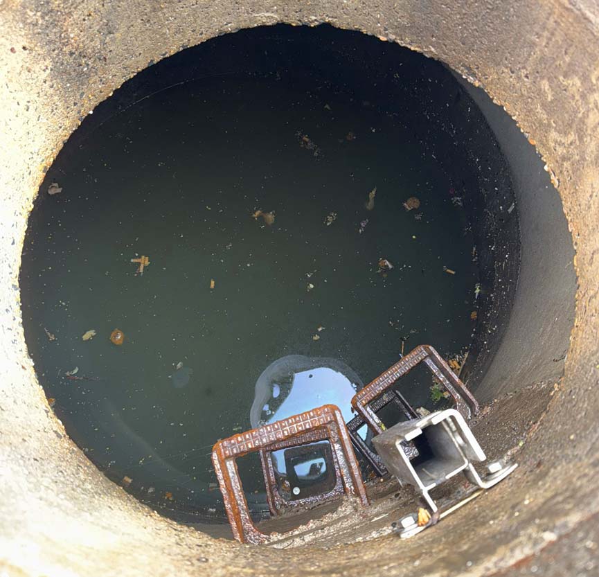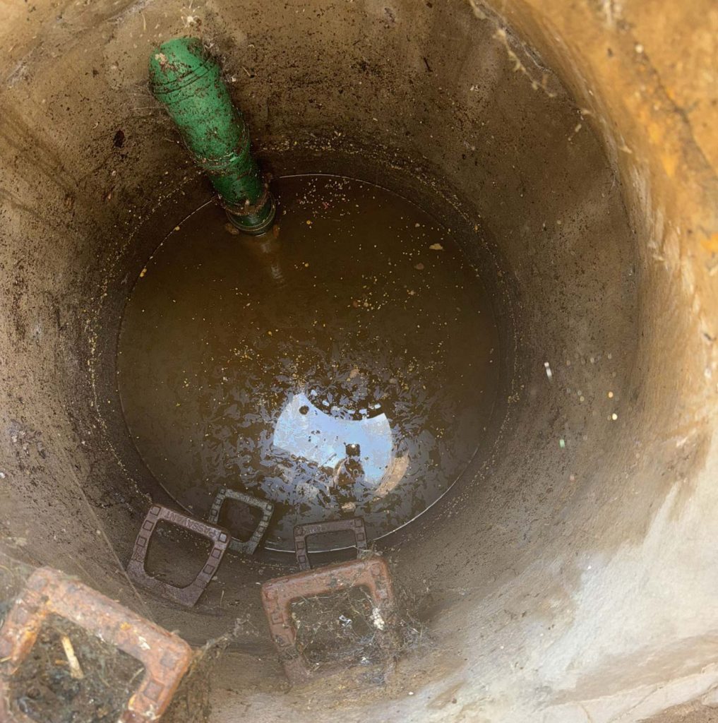 Wir spülten die Grundleitung auf dem Grundstück mehrfach mit Hochdruck. Doch trotz kräftiger Wassermenge sank der Pegel nicht: Ein erstes Indiz, dass die Blockade tiefer sitzt. - Blick in den öffentlichen Schacht