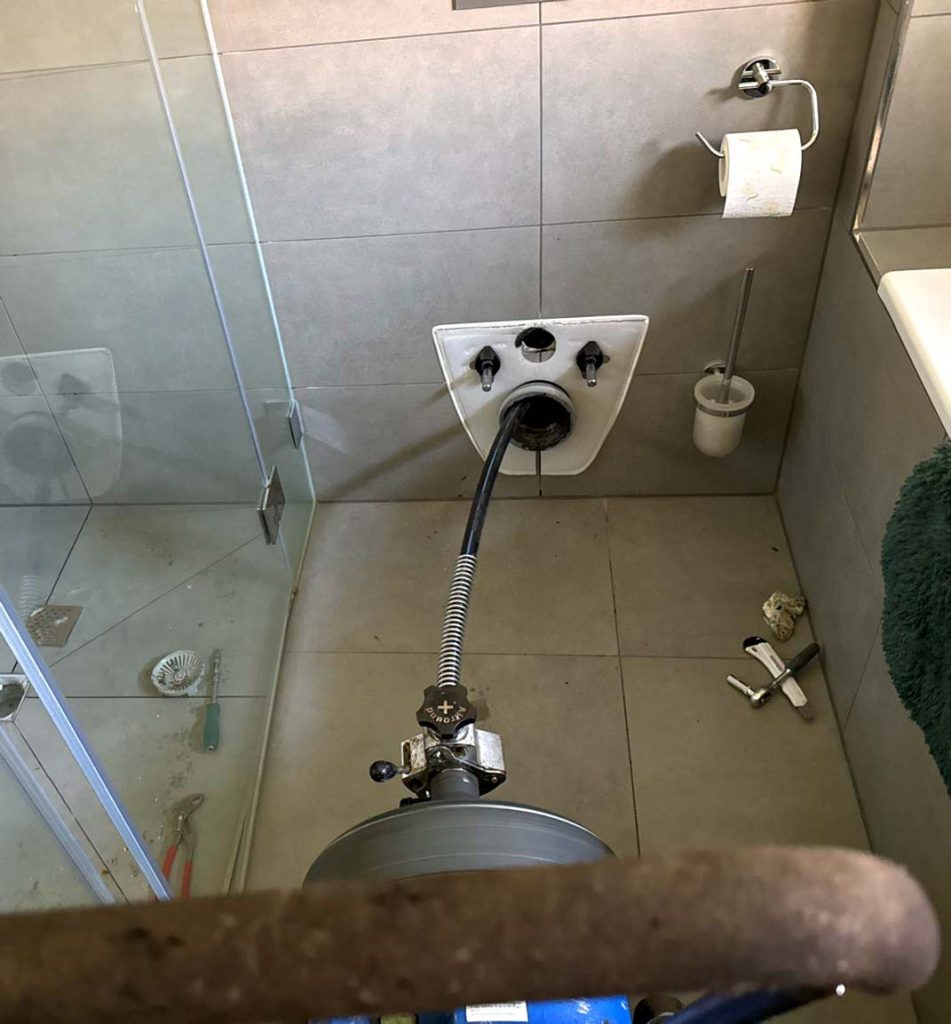 Noch während der Erstaufnahme zeigte der Wasserstand im WC, dass die Fall- bzw. Schleppleitung dicht sein musste. Mit einer flexiblen Spirale samt Schneidkopf lösten wir zunächst den Hauptpfropfen; anschließend spülten wir die Leitung mit mittlerem Hochdruck, bis das Wasser wieder frei in den Hausanschluss ablief. Zum Abschluss wurden Bad und Bodenablauf desinfiziert – Gerüche und mögliche Keime hatten keine Chance.