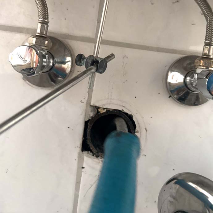 Nach der Ankunft prüften wir zuerst den Leitungszugang. Die eigentliche Blockade bestand, wie vermutet, aus Haaren und Seifenresten. Eine kurze Spülung mit unserer handgeführten Hochdruckdüse befreite das Rohr vollständig. Anschließend dokumentierten wir den Bruch in der Ablaufgarnitur und empfahlen dem Eigentümer, das defekte Bauteil zeitnah auszutauschen. Alle übrigen Anschlüsse wurden auf Dichtheit geprüft, sodass das Waschbecken direkt wieder nutzbar war.